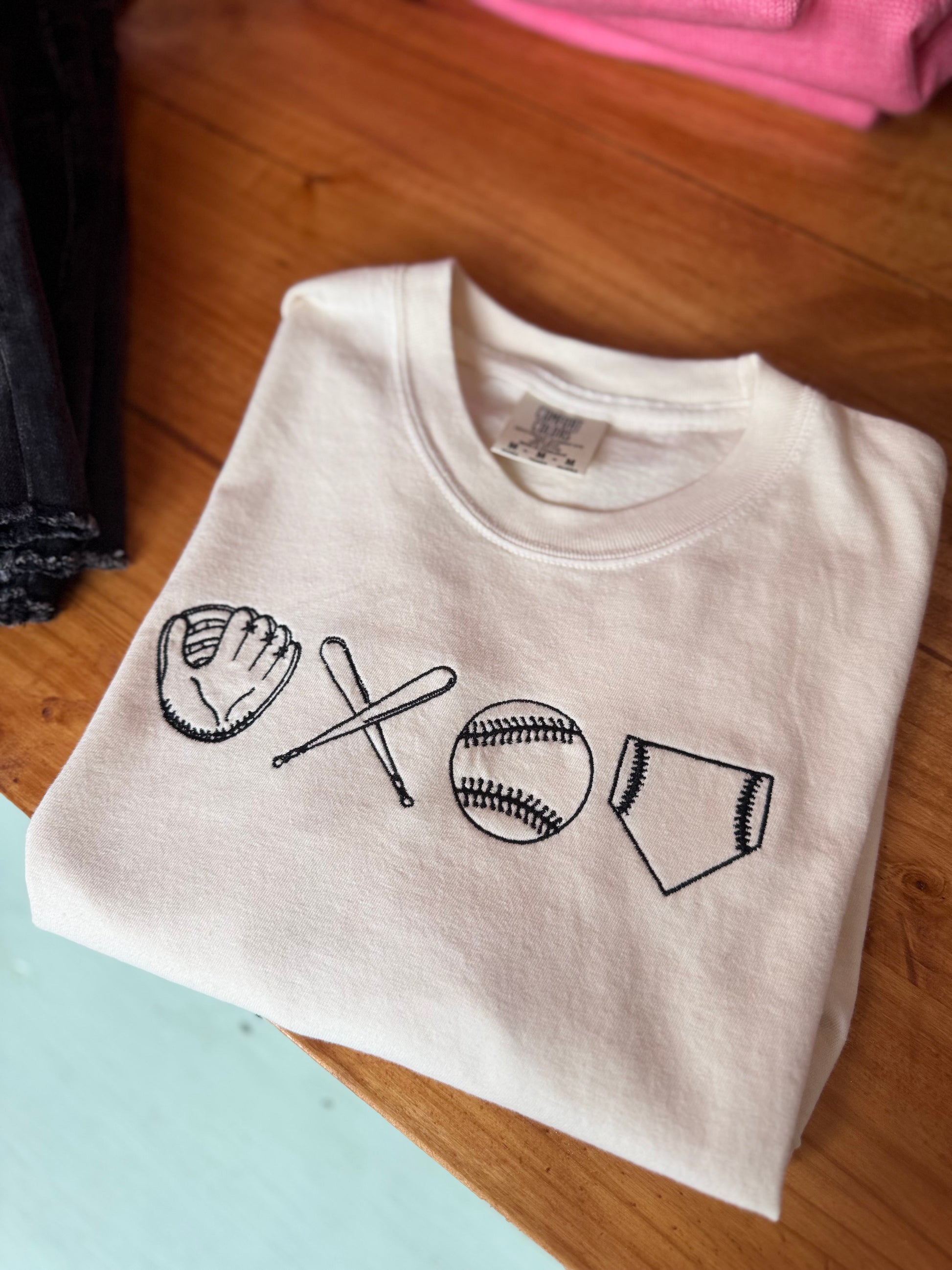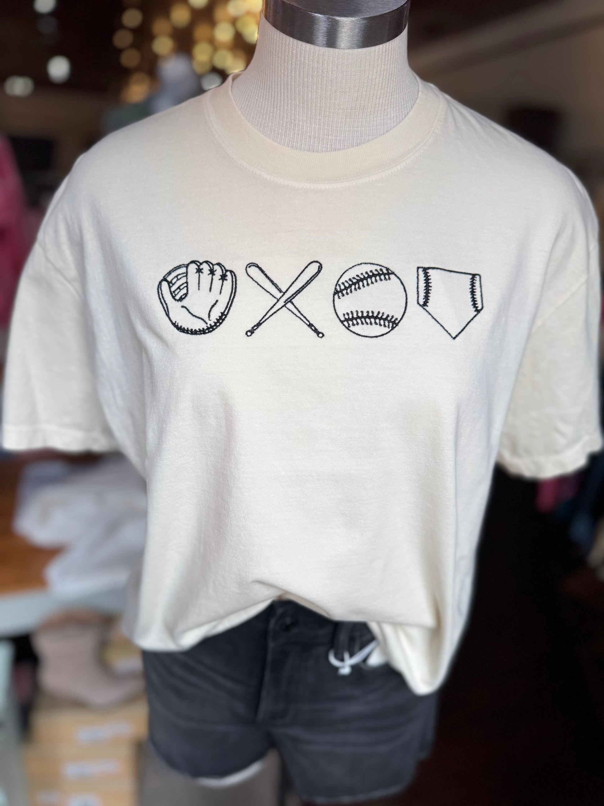 This Baseball Doodle Cropped Tee is the perfect addition to your sporty wardrobe. Made with a baseball inspired design, this cropped tee offers a stylish and comfortable option for any casual outing. Show off your love for the game while staying trendy and cool.