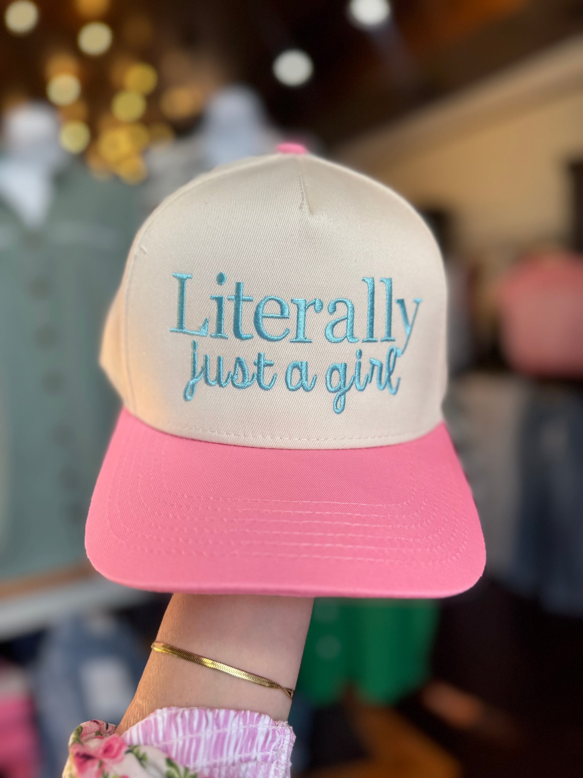 Be proud to show off your feminine spirit with our Literally Just A Girl Trucker! This pink and seafoam trucker hat is the perfect combination of sporty and girly. Stand out in style and make a statement with this unique accessory.